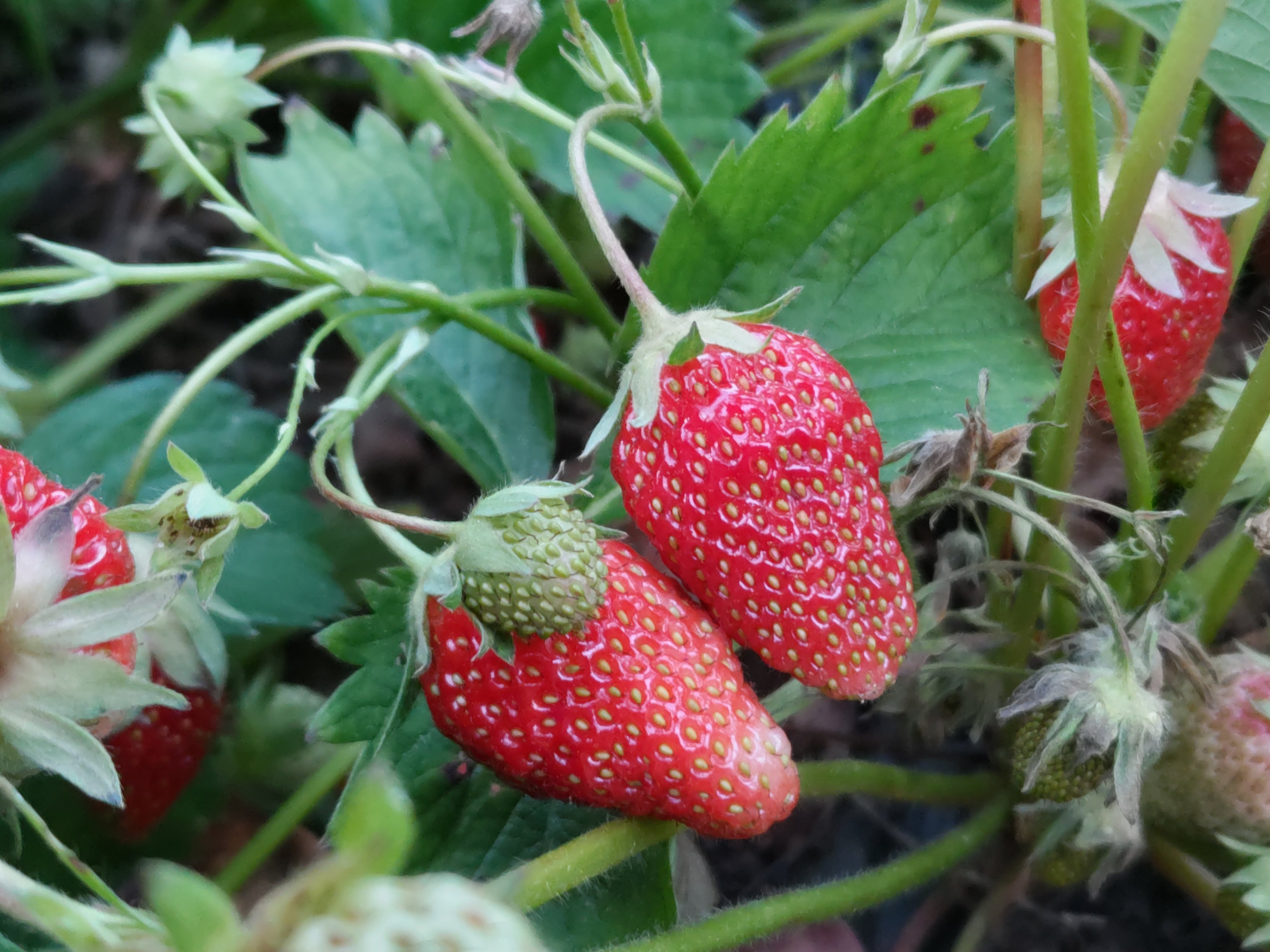 先日辺りから、畑の苺が色づき始めているのに気づいていた。そして、先ほど再び確認してみたら、ものすごい数の苺が真っ赤に色づいているではありませんか!
