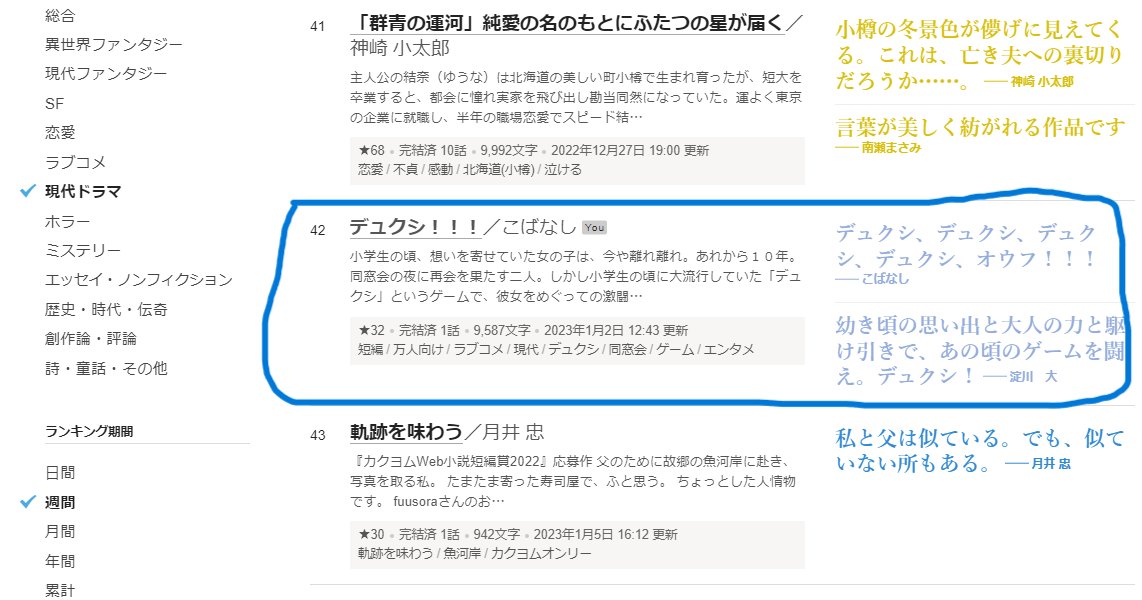 が、現代ドラマ部門の週間ランキング42位を記録しております。