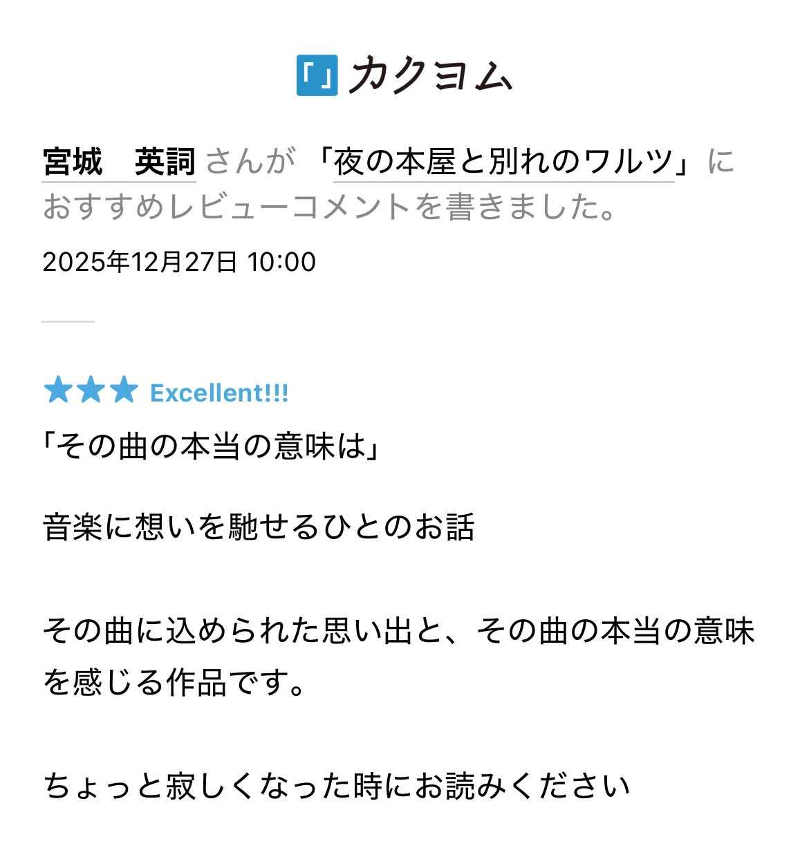 宮城 英詞様から私の作品におすすめレビューをいただきました😊
