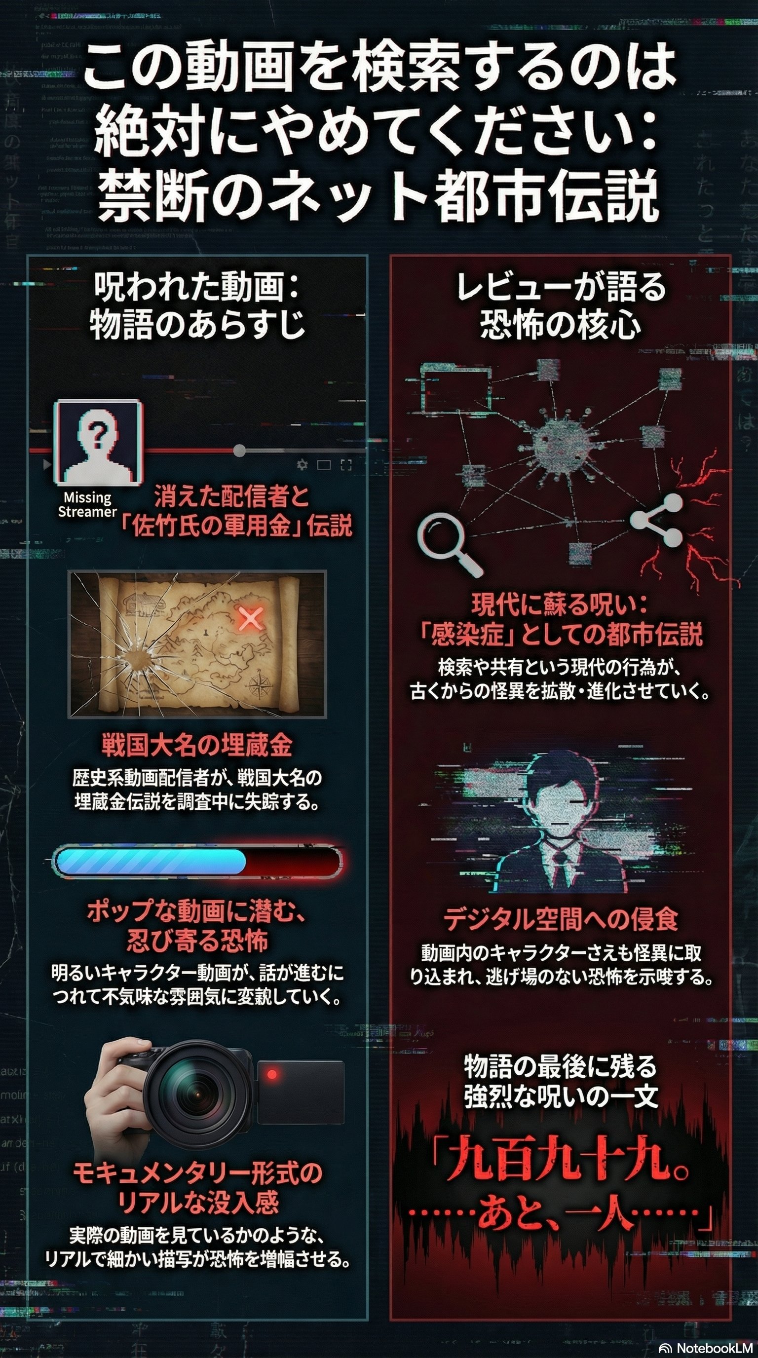 本作は「ぜんだもん」と「鎖国みかん」が、失踪した歴史系動画配信者が調査していた戦国大名佐竹氏の埋蔵金伝説について動画で取り上げ、深掘りしていくモキュメンタリーホラーです。