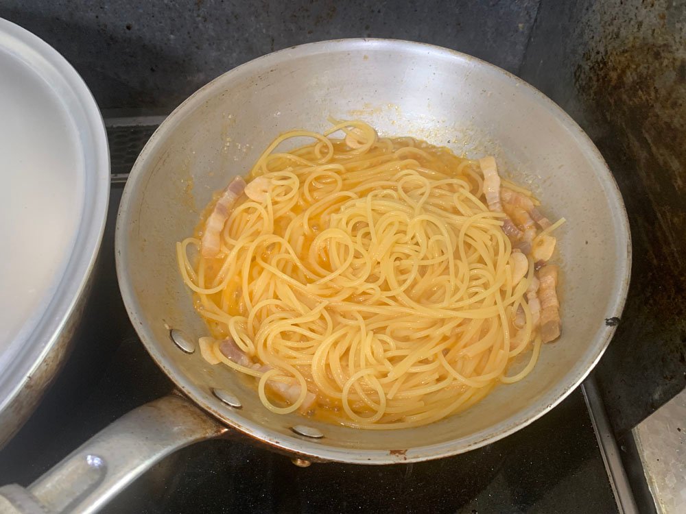 カルボナーラから、卵・黒胡椒アウト、ニンニク・唐辛子・チューブのトマトをインしてみました。とりあえずこの状態から引き算ですね。