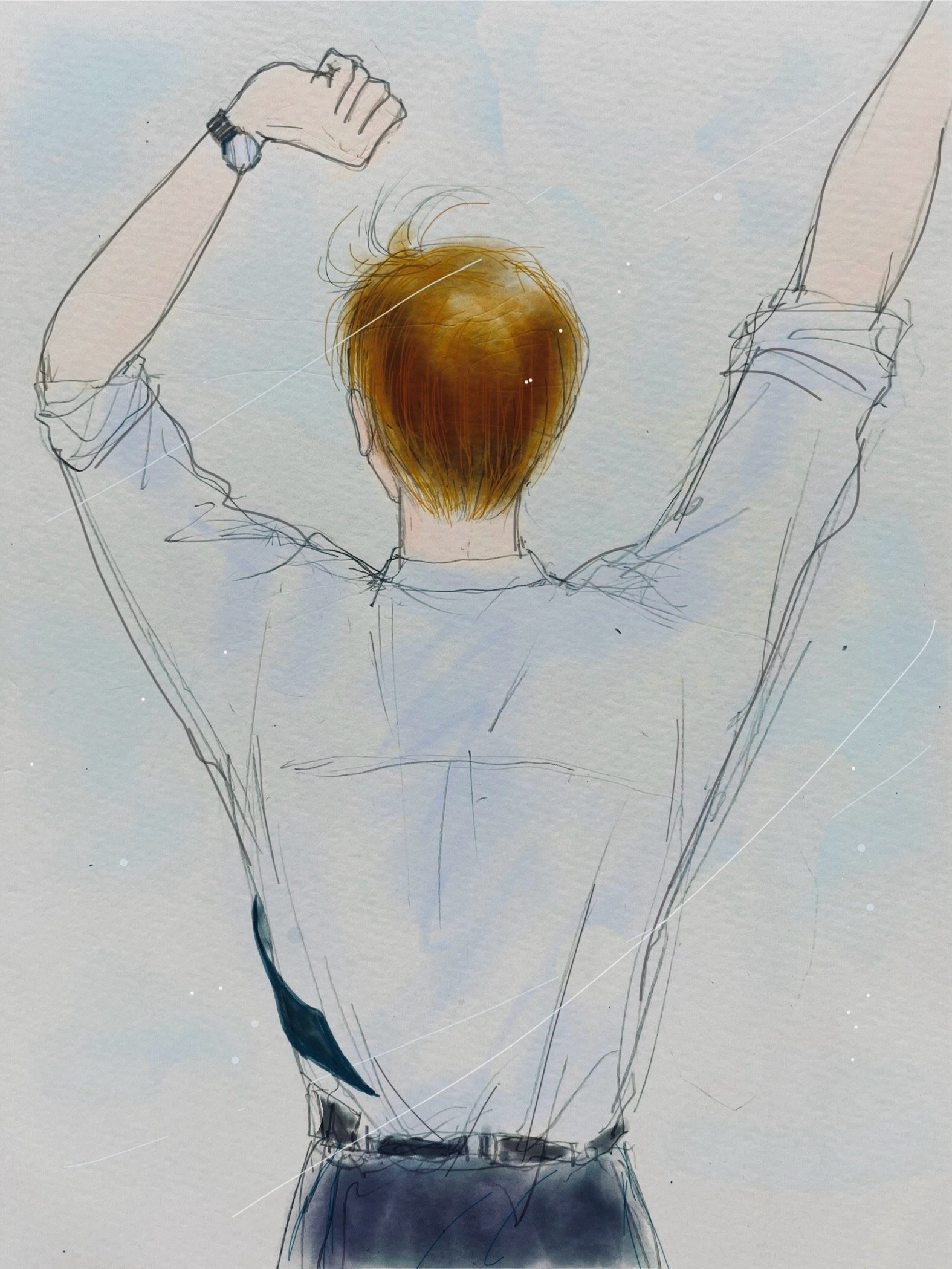 心身ともにバタバタモードで最近ちょっと離れていた落書き。やっぱ楽しいー。休憩時間の新社会人くんの背中のイメージです。新しい仕事に夢中で向き合った後のほっと一息タイム。