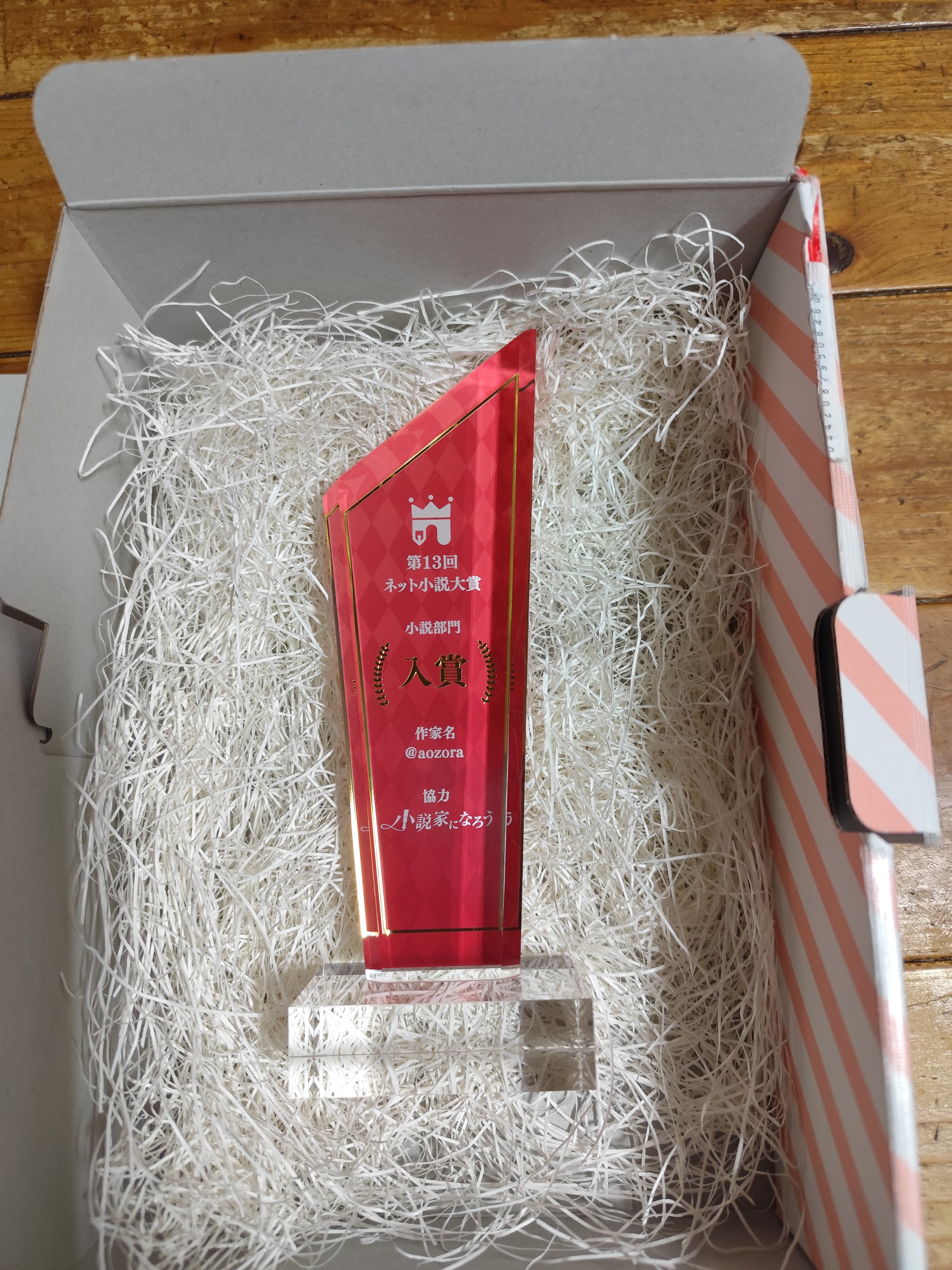 第十三回ネット小説大賞の小説部門入賞トロフィーが届きました。