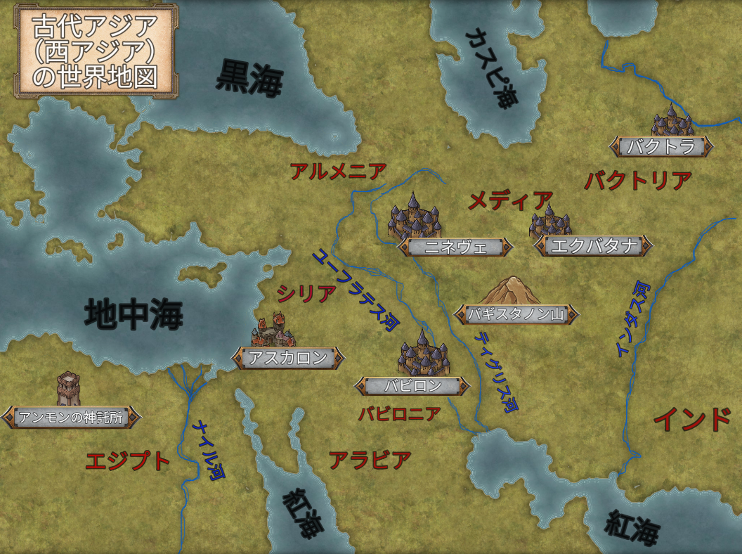 都市や山や施設は白文字で記されています(例:図中のバビロン、バギスタノン山)。