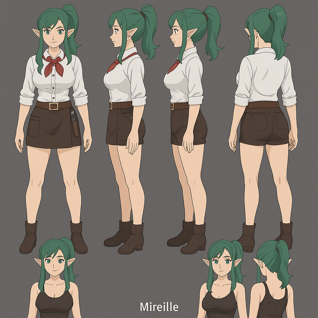 勝気、美貌、エルフ、緑髪、エメラルドの瞳、ポニーテール、巨乳、ショートパンツ(短め)などなど、多くの注文を突きつけて生成しました!