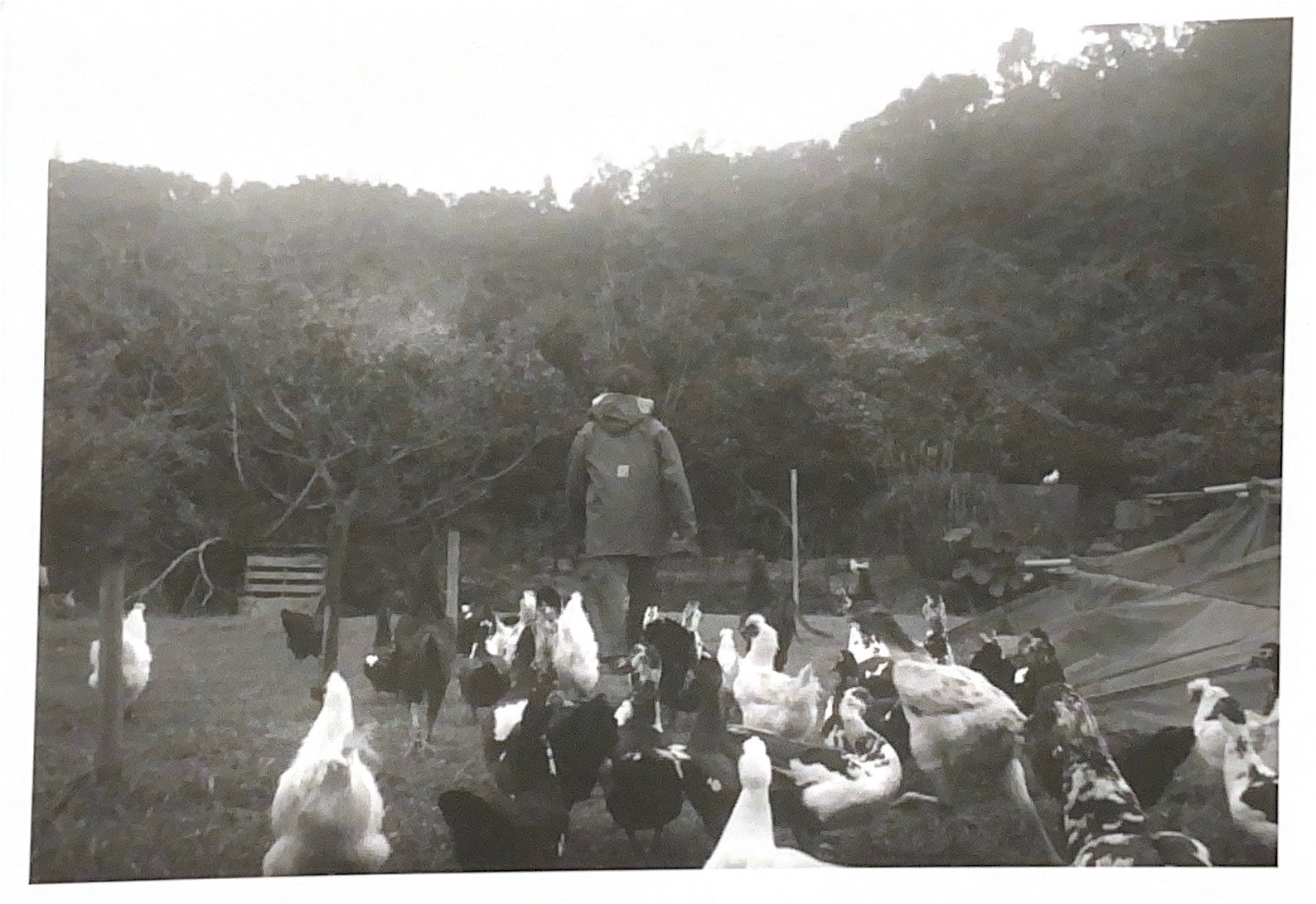 たしかハルさんかトモくんの、穴空いてボロいけど捨てずに一応とってあったカッパをもらって、ガムテープで貼って着てました。背中の四角いのがそう。