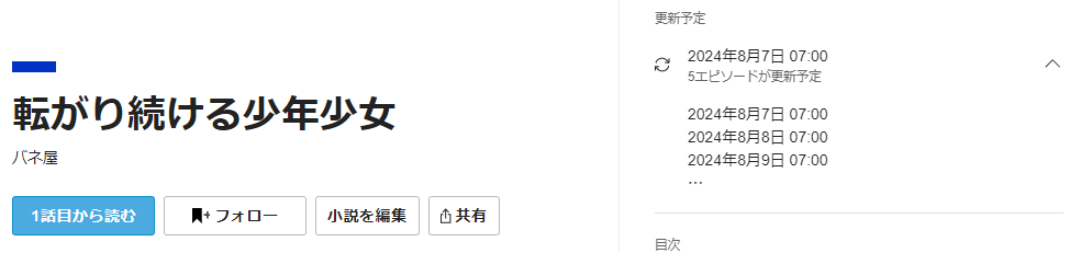 『転がり続ける少年少女』の第22章(5話分)を書きましたので、明日から少しだけ更新再開します。