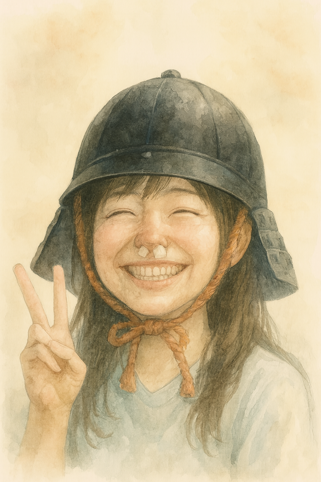 兜を被り、鼻にティッシュを詰めたままピースサインをする栗林さんは、百点満点の笑顔だった。