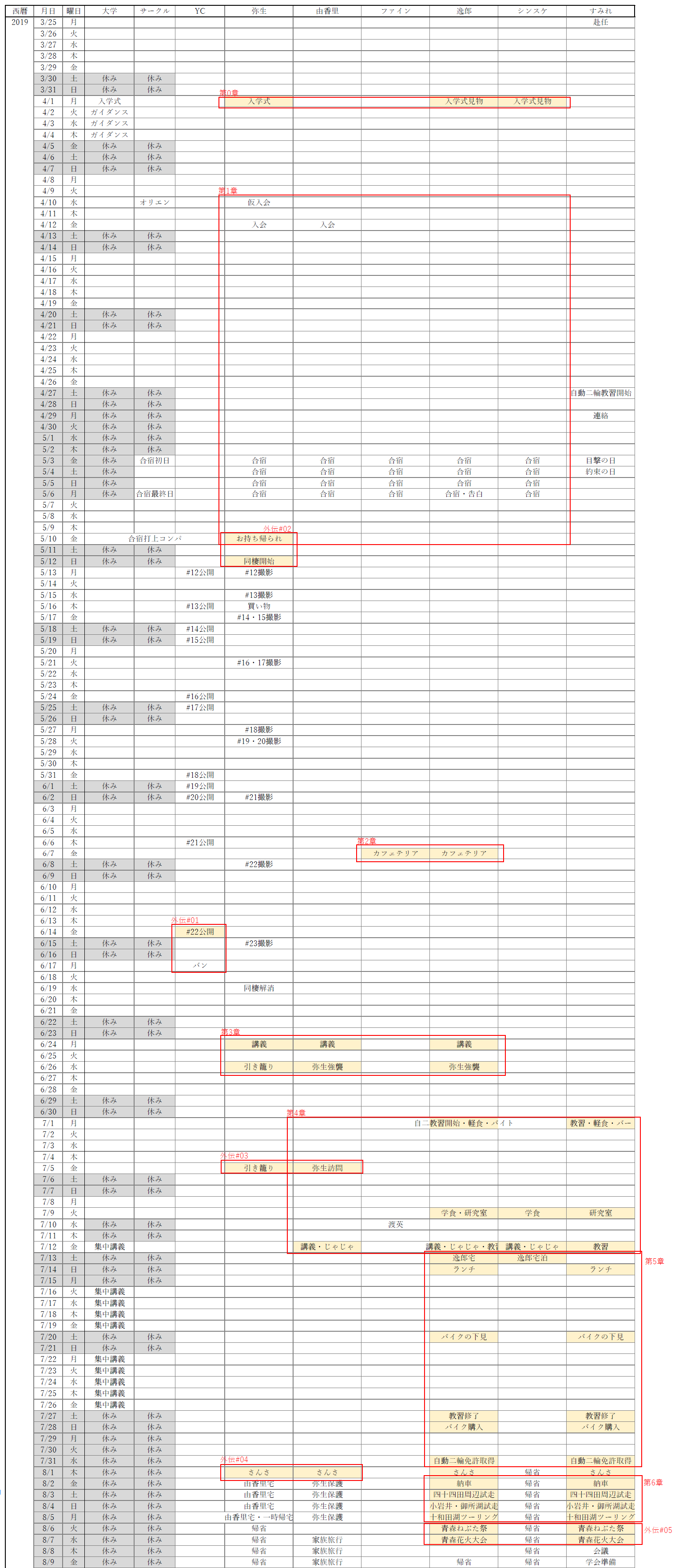 その足りない筆力を補うために、僕自身が執筆中に迷子にならないよう作成したカレンダーのうち、ここまでの分を、ここに置いておきますので、お暇な方はご笑覧ください。
