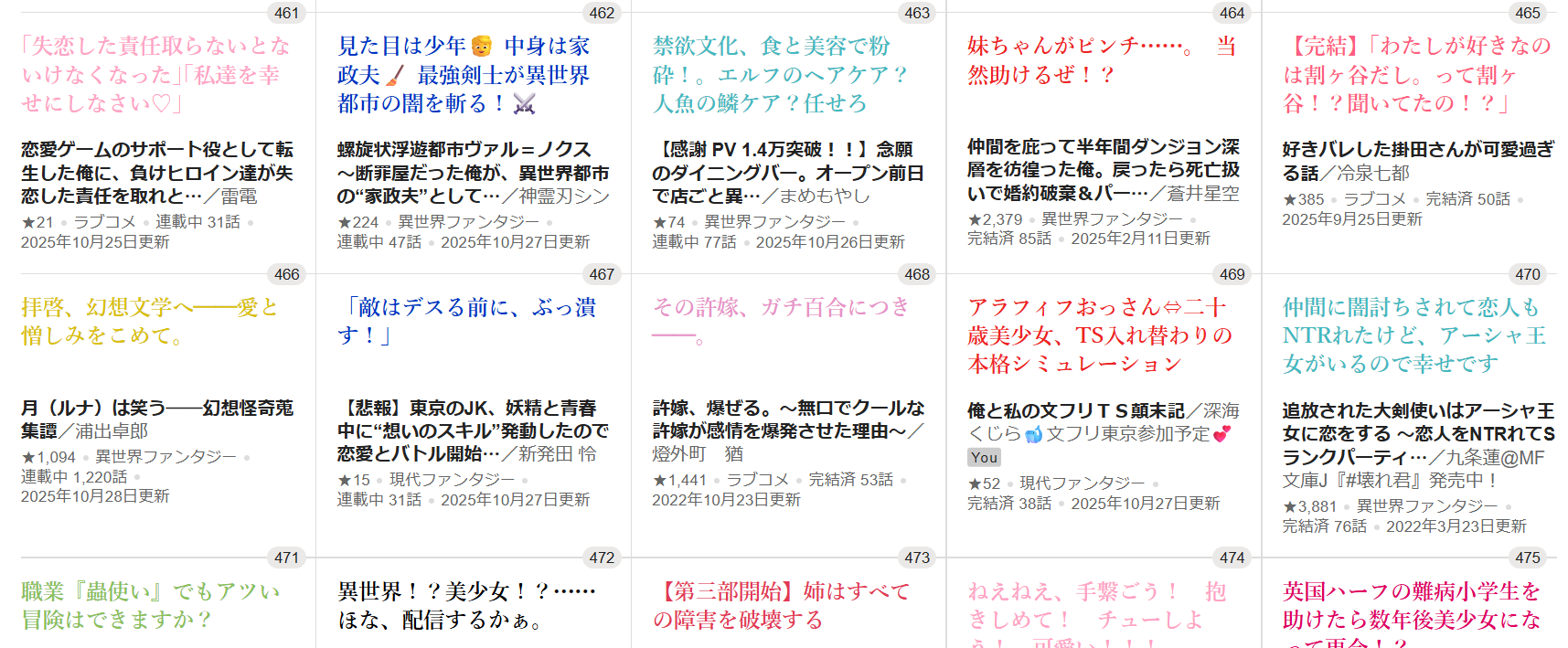 本日付のGAウェブ小説コンテスト週間ランキングは469位。順位での一次通過はちょっと望めそうにないので、あとは運営に目が止まるかどうか、ということでしょうかね(目に留まっても選ばれないってのは考えんのかい!?)