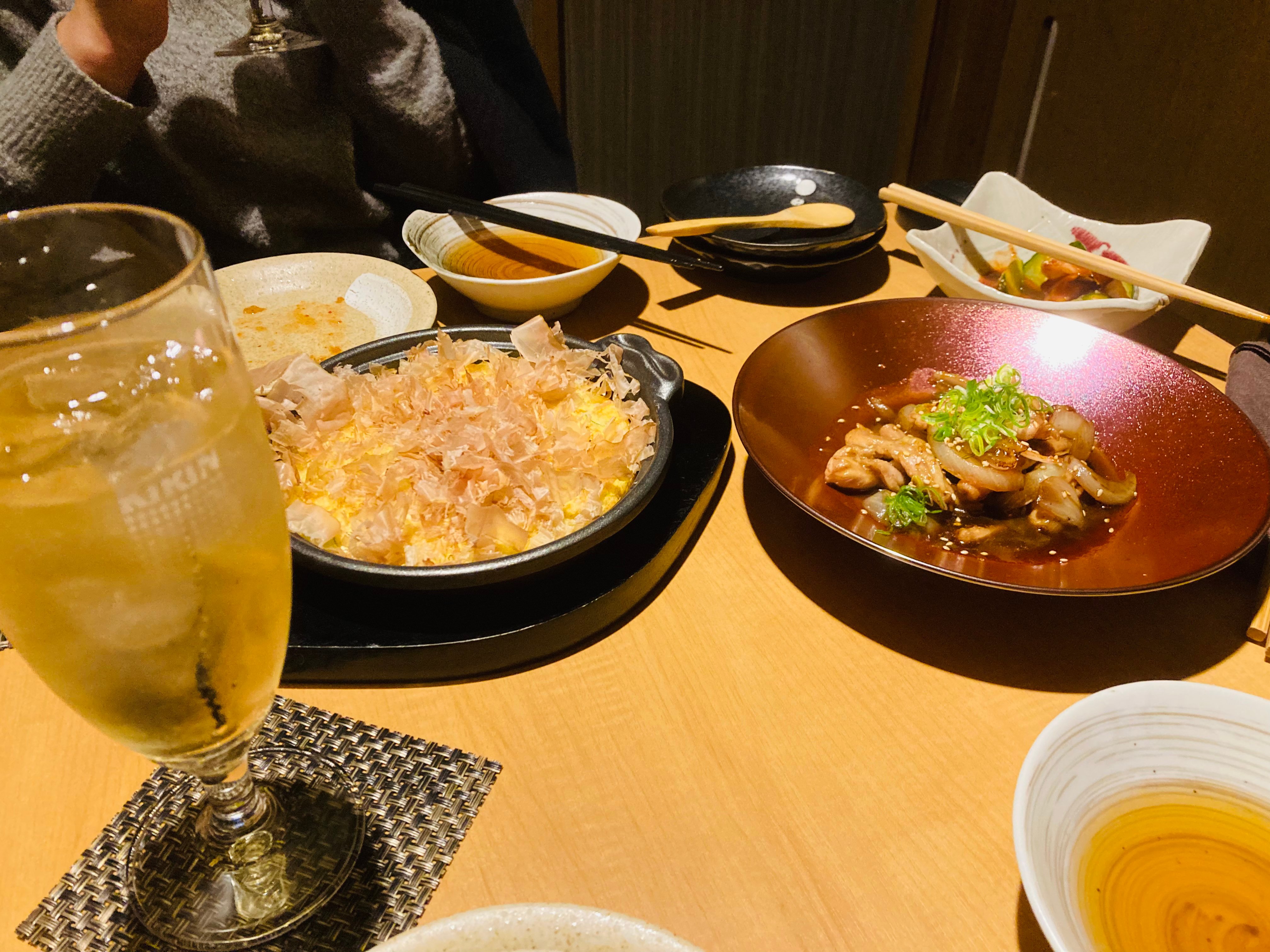 お刺身、タコキムチ、トリ唐揚げ、山芋鉄板焼き天だし、鳥セセリのタレ焼きを頂きました。