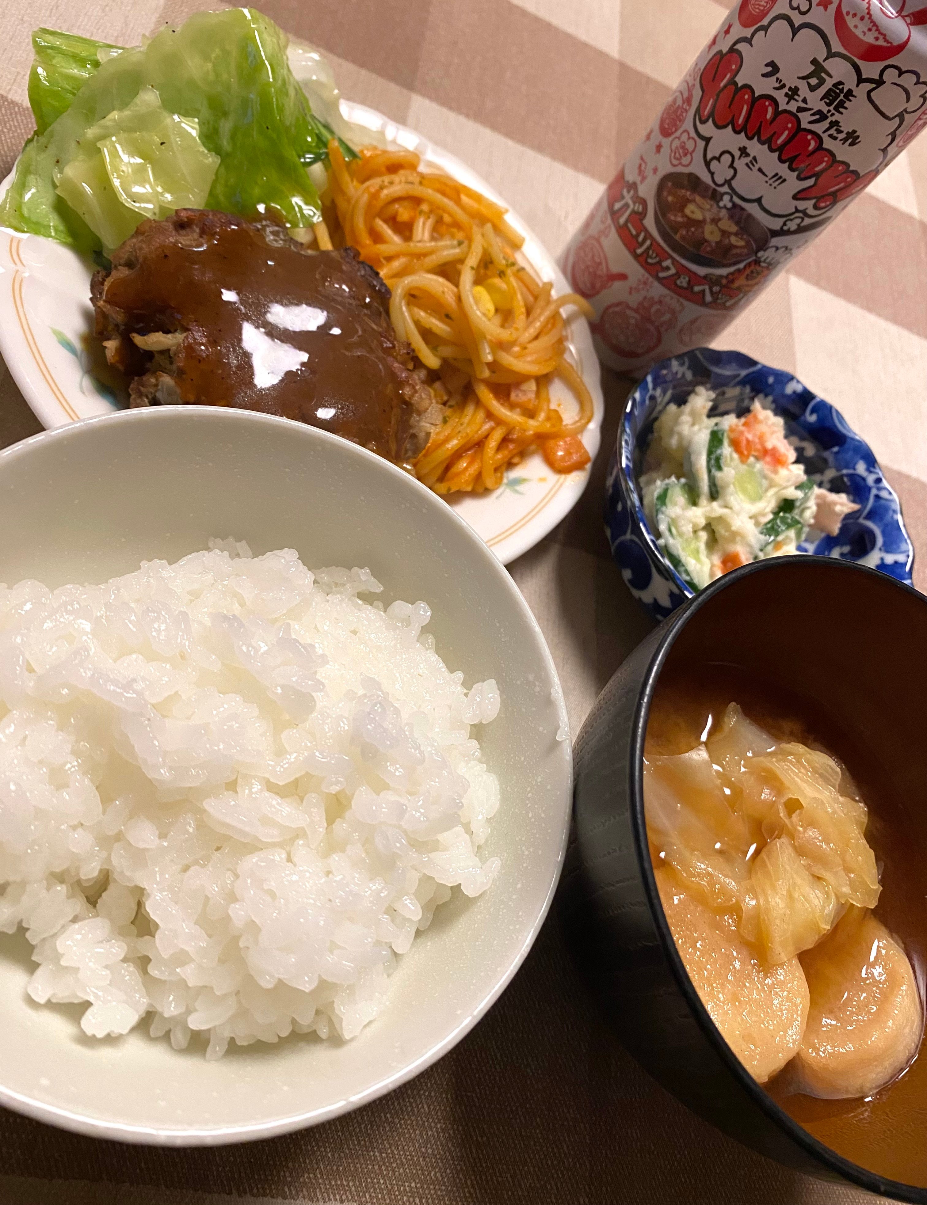 ハンバーグ、キャベツとお麩のお味噌汁、ポテトサラダ、やみつきキャベツ作りました!
