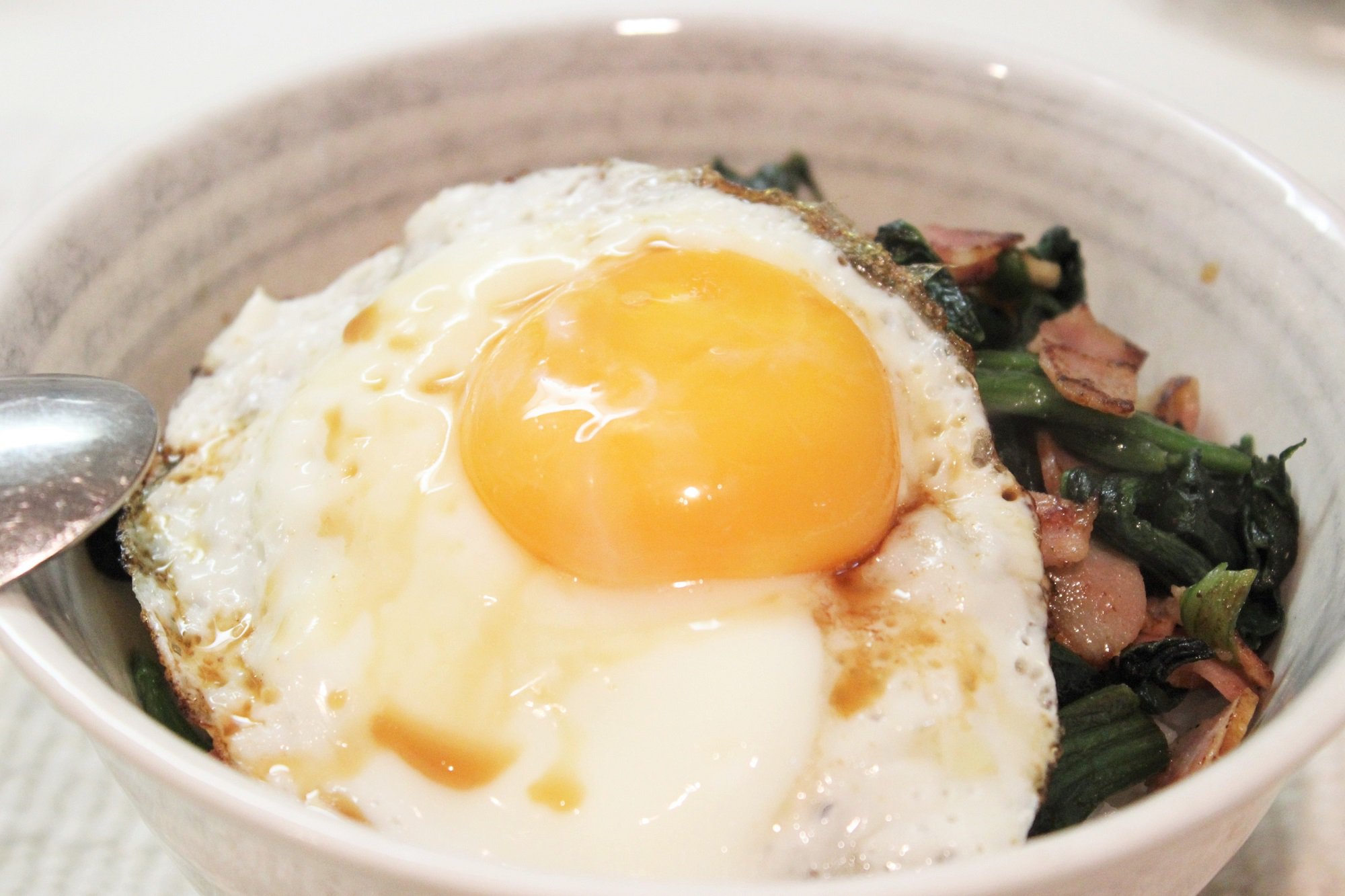 アリア専用のメニュー表から彼女が選んだのが、この「ほうれん草ときのこ、ベーコンのバター炒め丼」でした。