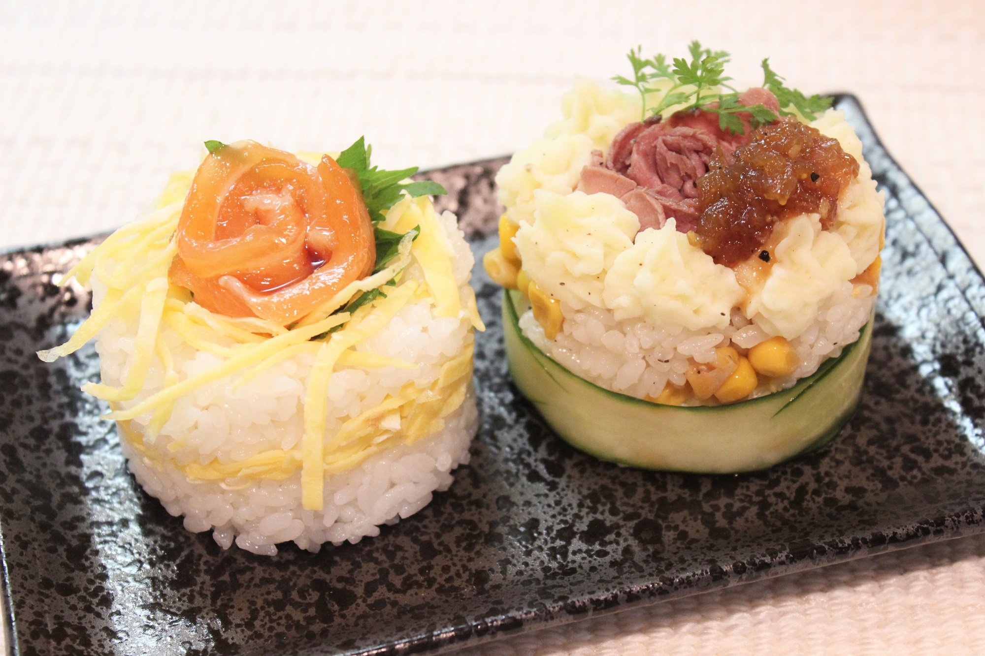 アリアの案を基に「味も見た目も妥協しないごはん料理」を作ろうとフェリクが改良し、この「サーモンと青じそ、錦糸卵のライスケーキ」と「ローストビーフとマッシュポテト、コーンのライスケーキ」が誕生しました。