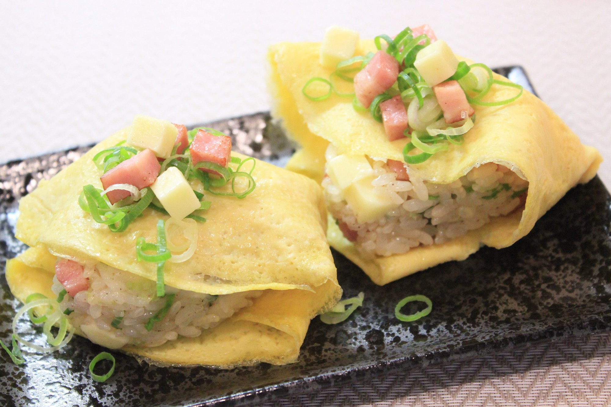 「異世界ごはん無双」の書籍発売記念SSに登場した、「ベーコンとチーズ、ねぎの卵包みおにぎり」の作り方をご紹介します(*´ω`*)