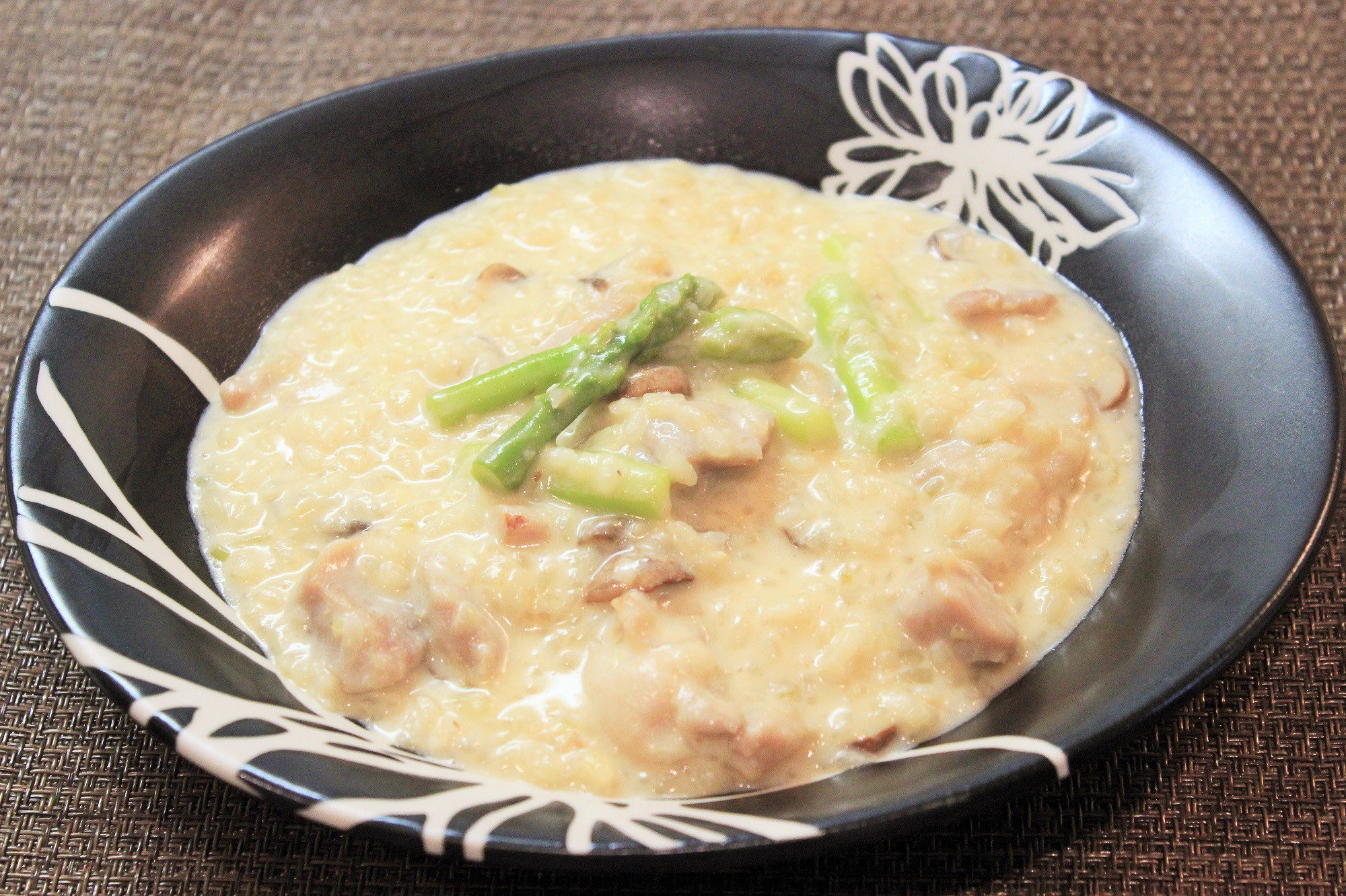 ◆鶏肉ときのこ、アスパラの味噌入りチーズリゾット