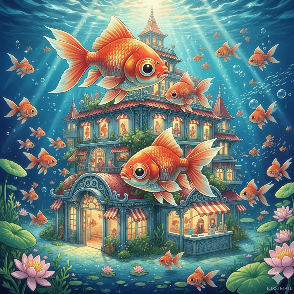今日のお目覚めイラストは「水中ホテル『金魚』」です。