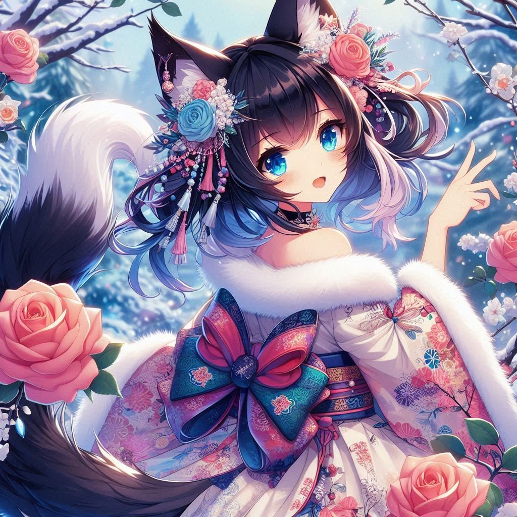 🎨【大晦日のイラスト】「冬薔薇(ふゆそうび)の猫乙女」