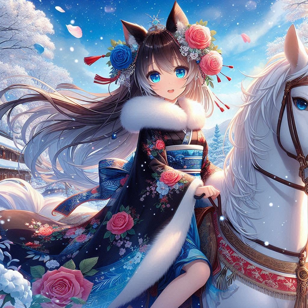 朝のイラストは「猫耳少女と白馬、冬道で」です。