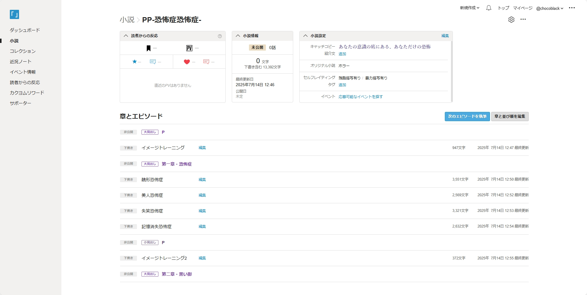 現時点で第一章を書き終え、第二章を書いています。下部に各話どんな感じなのかわかるように貼っておきます。文字数的にもっとペースを上げていかないと間に合わないので頑張ります。