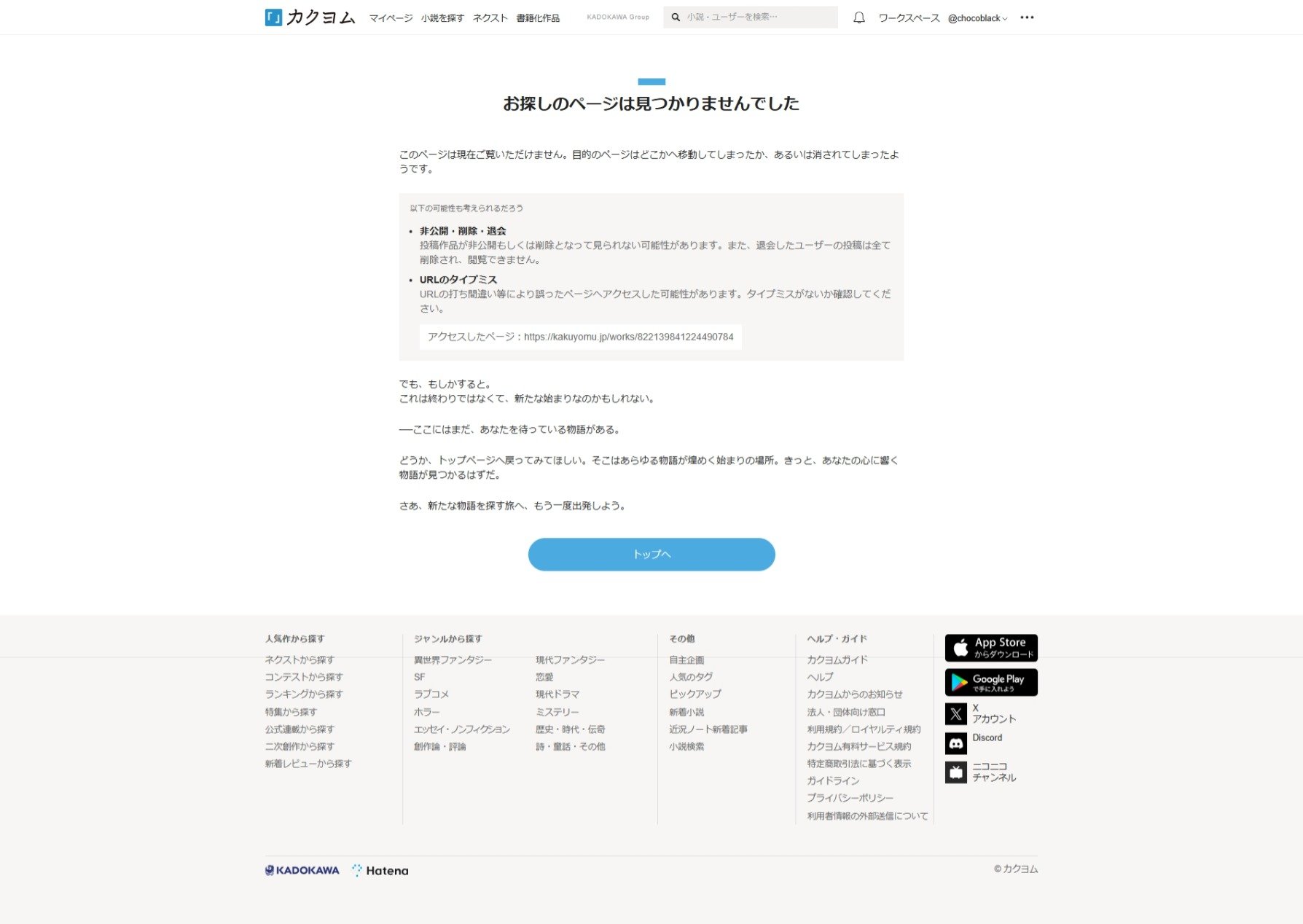 そして昨日ある作品のページに飛んだところ、「お探しのページは見つかりませんでした」というページが出てきました。