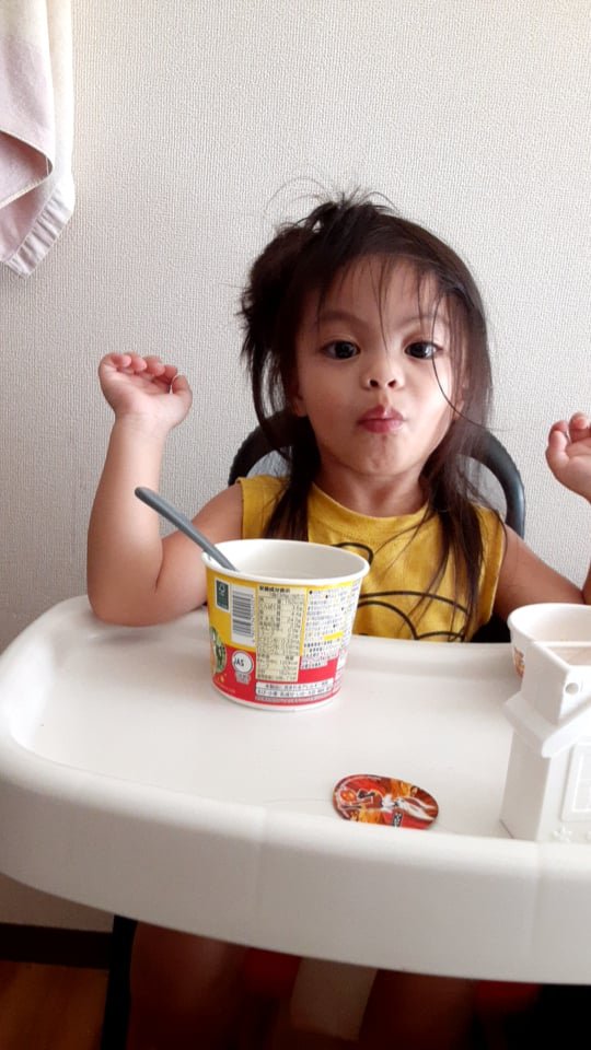 写真はシノアの大好きなピカチュウのラーメンを食べているところ。