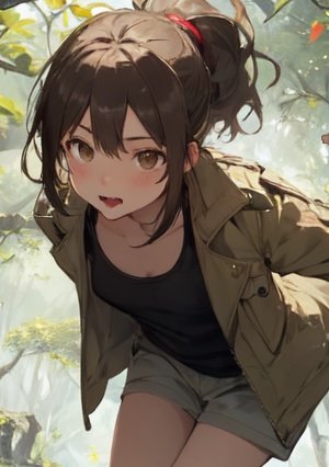 木の枝をくぐって歩いてくる構図に見えます。
