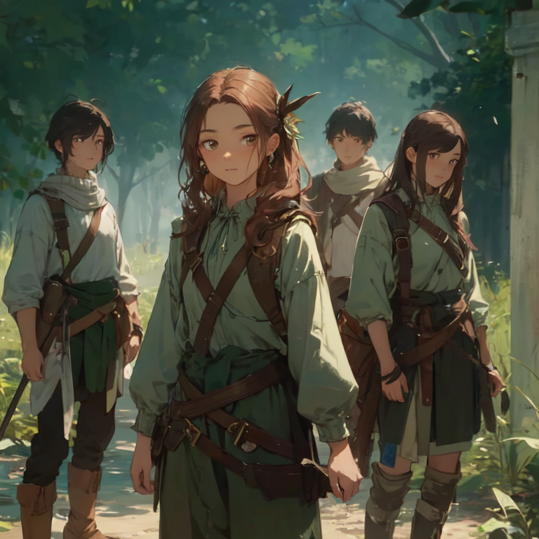 フェモ (女性): 18歳。肩にかかるくらいの長さの、落ち着いた栗色の髪。目は大きく、優しげな印象だが、狩りの際には鋭い眼光を放つ。動きやすいように仕立てられた、モスグリーンの布製の服を着用。腰には薬草を入れた小さな革袋を下げている。手先が器用で、自作の精巧な羽根飾りのついた帽子を被っている。
