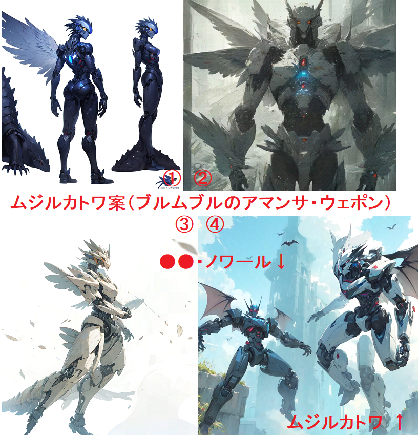 ③は②にも似ていて「トリ」というモチーフが強く出ていていいなと思います。描き手がメカのバリエーションがあまり豊かでないのか、どうしても先のウィルミーダに似てしまいます。翼メカを指定した私の責任もありますね。③に関してはぱっと見ではドラゴンっぽくも見えます。アマンサ・ウェポンはドラゴンに似ている必要はないのですが、かっこいいからそれでもいいです!