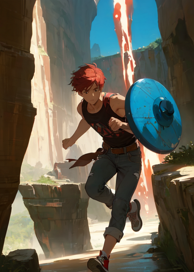 アスミチが炎に包まれ、トキトは金属棒と青い盾を手にして――