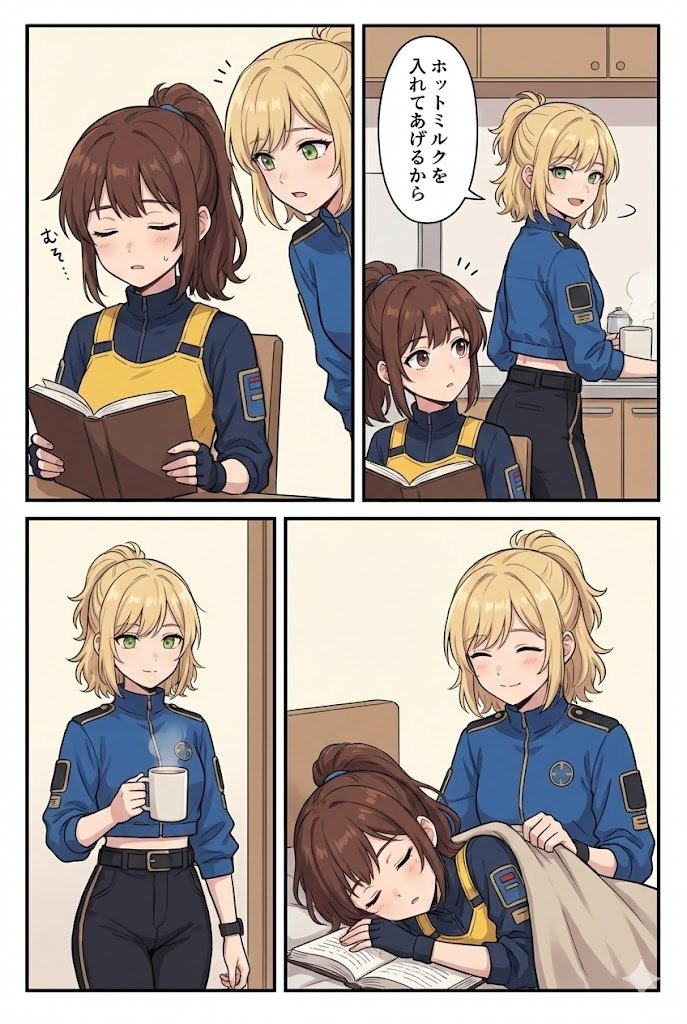 これらの人物から女子二人を選び、四コマ漫画を作って。眠くてたまらないがのに本を読み続けようとする子に「ホットミルクを入れてあげるから」(そうしたらあったまって眠くなると思う)と言う子。用意をして帰ってきたら、もう本を読んでいた子は突っ伏して眠ってしまっていた。