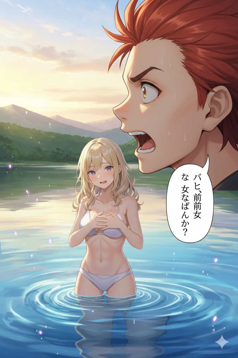 水浴びのシーンを読んでもらったら絶対拒絶をしてきたAIですが、水着があれば描いてくれました。体を隠して物語通りのほうが、よほどセンシティブから遠いはずなのに……!