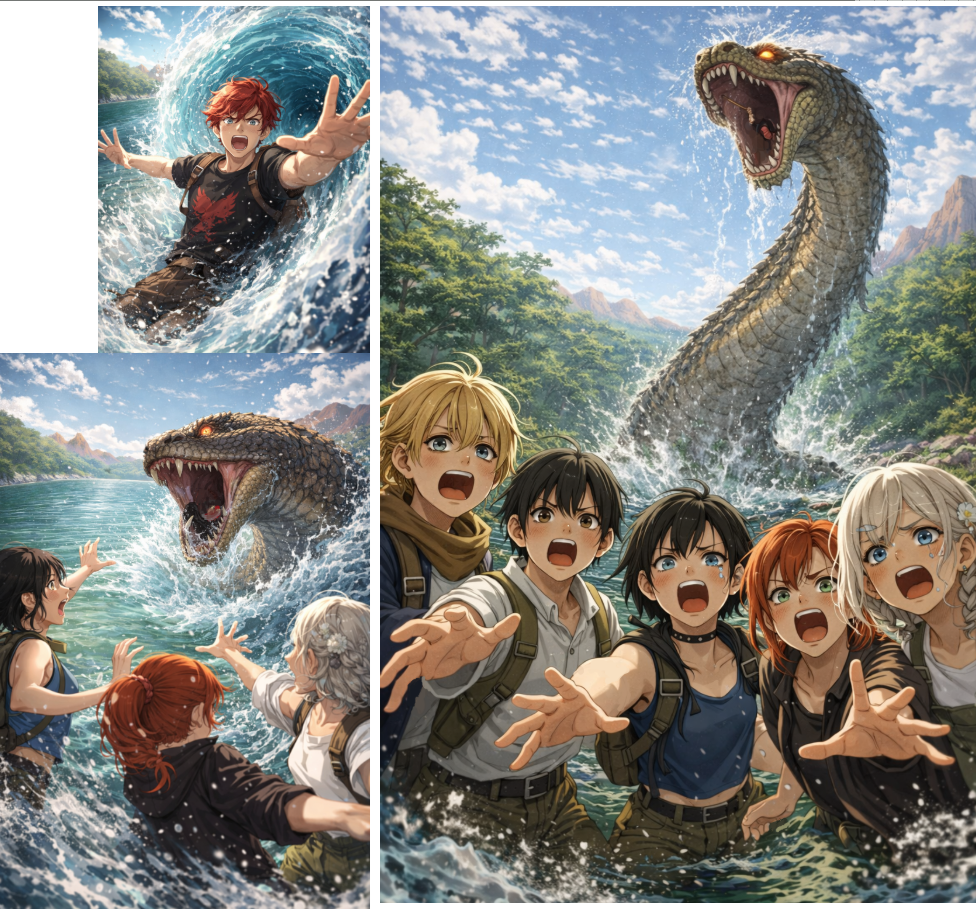 『雲の高さから五人が……落ちる!』シーンより、いいところ、よくないところがありますね。人物一覧表に近いのがいいところ。フードの人物などがおらず、おおむね「この人物はパルミ、こっちがアスミチ」などとわかります。