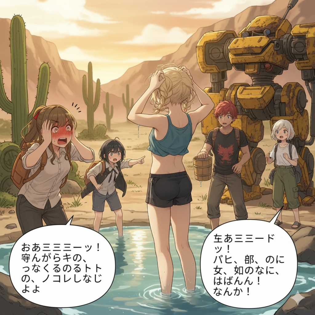 仮説です。たぶん漫画家(AIのこと)にはアスミチとパルミの区別がついていません。今回はパルミの位置にアスミチがいます。同一人物だと思っているんだと思います。パルミがいるとアスミチが家出、アスミチがいるとパルミが家出しがちです。アスミチまで目撃者になったらダメでしょう!