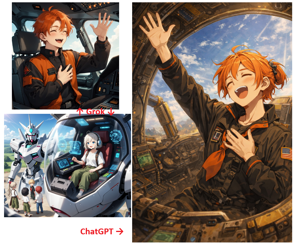 前回のは Google Gemini でしたが、今回はイーロン・マスクさんの肝いりの Grok と、近ごろでは評判の描き手 ChatGPT の作品です。