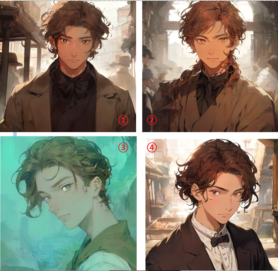 以前のプンマースに近いのが④ですね。もうちょっと髪を短くして印象を男っぽくしたいなと思うと①がよさげに思えます。でも目がやさしいから、目つきはもっと悪そうなほうが……と迷います。