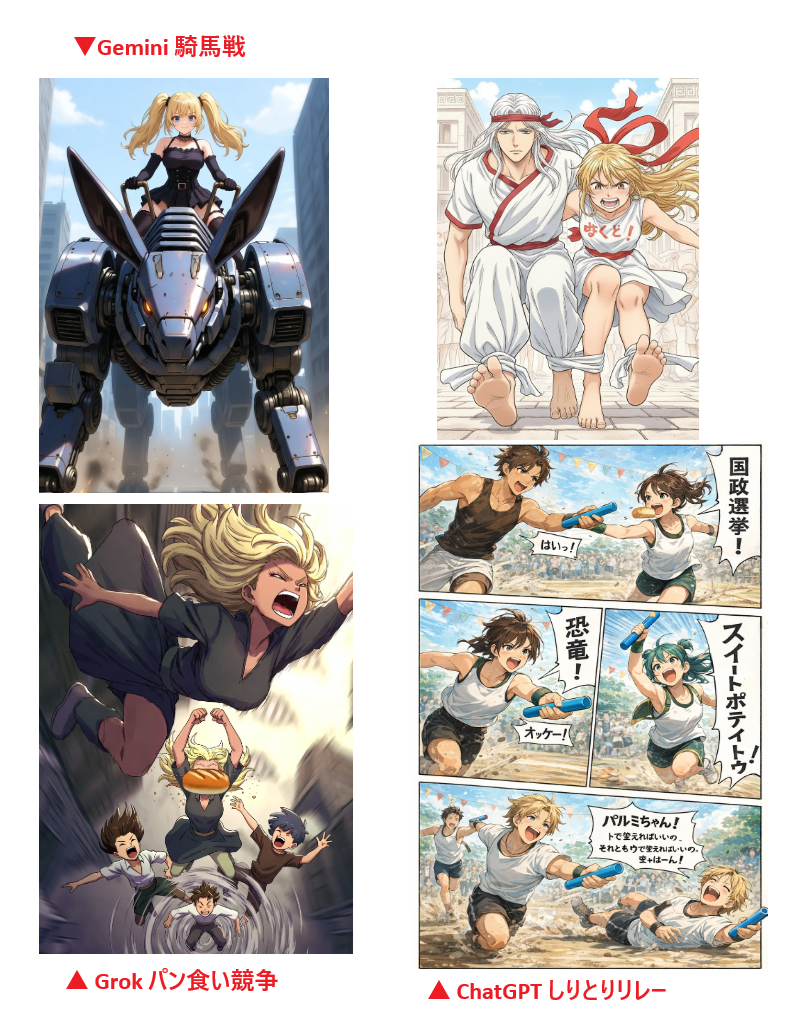 最後のはこまかく私が指定した「しりとりリレー大会」をチャッピー(ChatGPT)が描いてくれたもの。