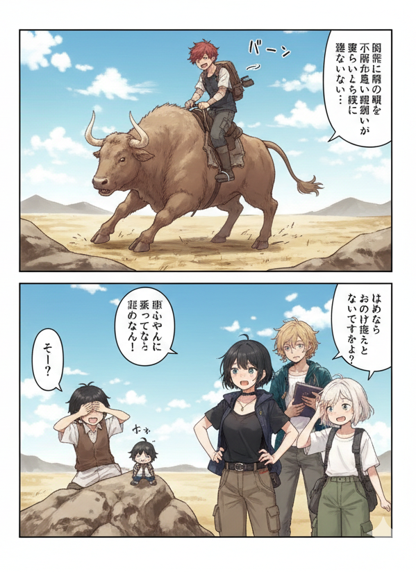 もしよろしければ、この解読結果をもとに、吹き出しの中身を正しい日本語(「野牛の乗り心地はどうだい?」など)に書き換えて、もう一度画像を生成し直すお手伝いをしましょうか?」