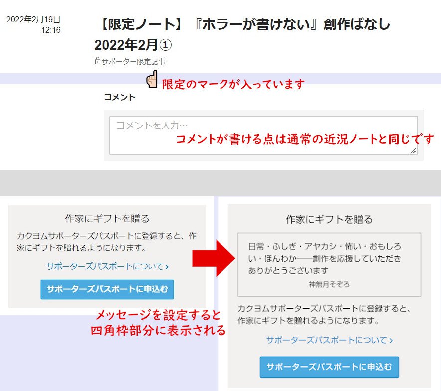【限定近況ノート】を開くとタイトルの下に「🔒サポーター限定記事」と表示が追加され、区別できるようになっています。