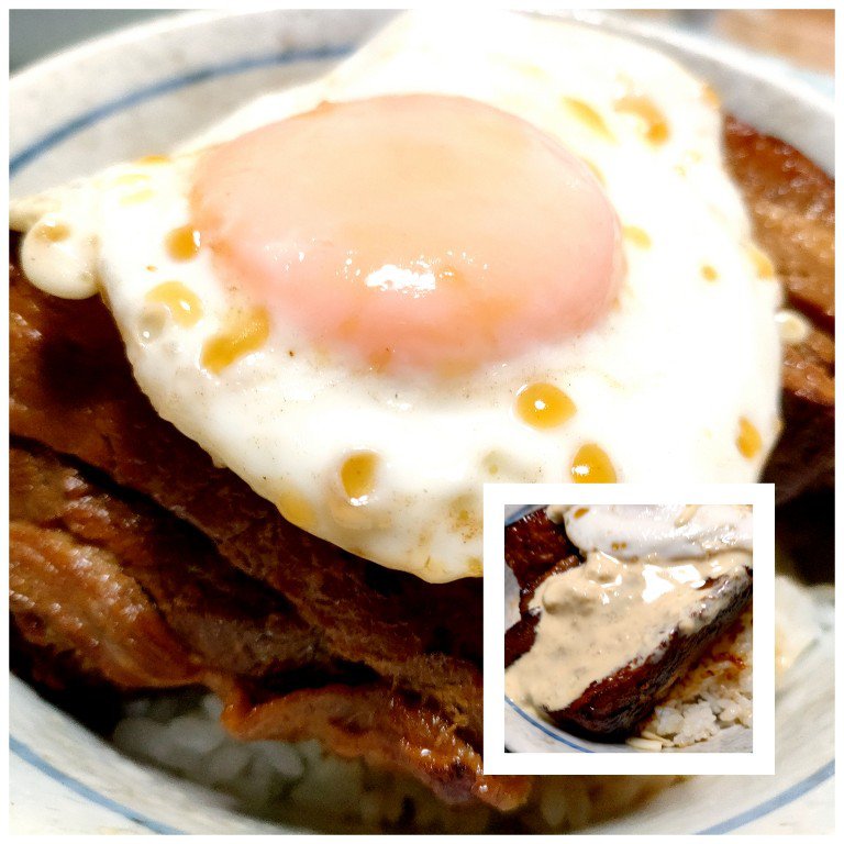 ご飯をよそって、チャーシューを好きな大きさにカットして、目玉焼きを乗せて、好みで煮汁をかけて完成!