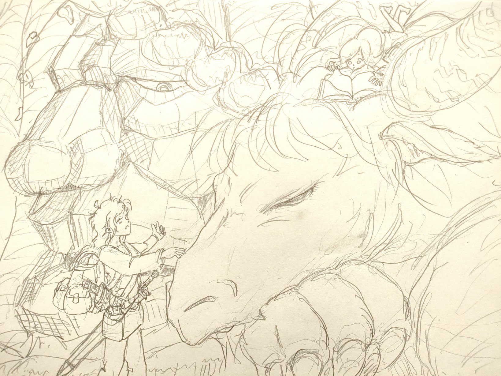 ルカはノートが背負っていたリュックを背負わされております。ノートが聖典を読むために。しかし、カイチの上で寝そべりながら、足をパタパタさせて、お気楽ノートです(笑)