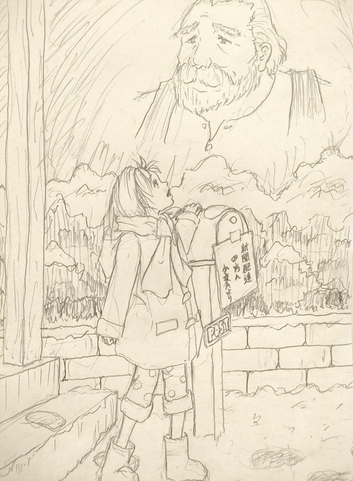 あまり降らない地域での積雪。パジャマにコートとマフラー、長靴。ポストやアプローチなんかもまあ、描かないですからね〜。