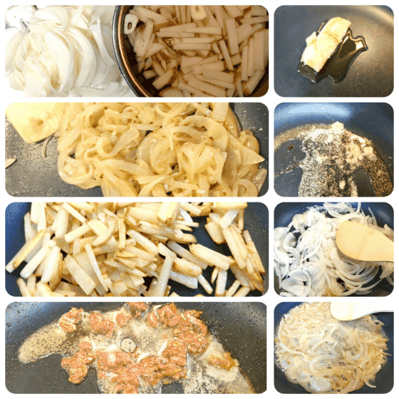 さて、玉ねぎをバターで炒めるとあるのですが、私は玉ねぎしっかりと炒める派なので、レンチンしてからバターが焦げ付かないように少しだけオリーブオイルを混ぜて写真の通り色がつくまで炒めました。この時、早く仕上げる方法として、水を加えて煮切るようにすると、とても早いです。うん、甘くて美味しい。