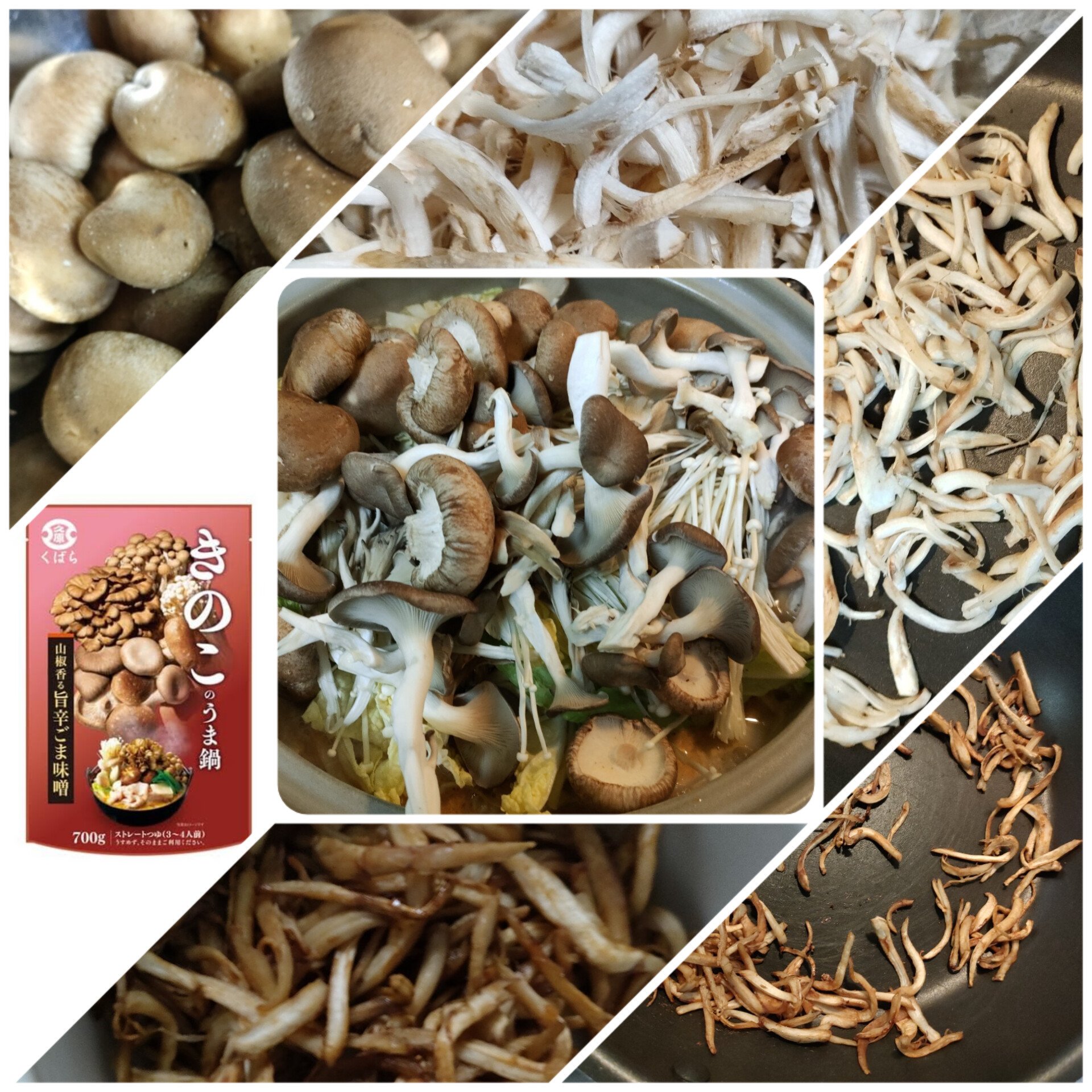 市販の鍋の素を使いました。きのこは、えのき、椎茸、舞茸、ヒラタケの四種類。