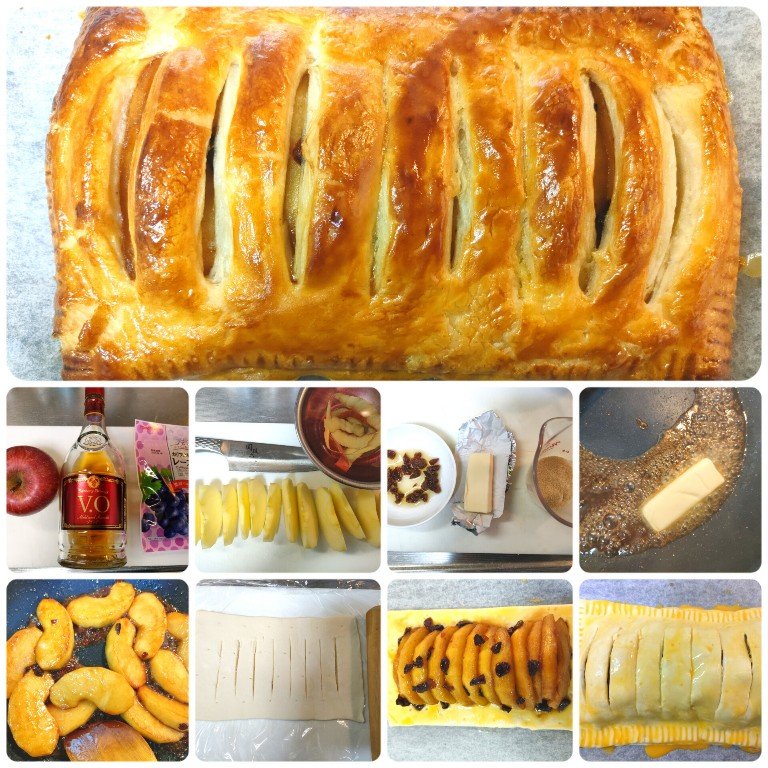 ①パイシートを出して解凍しておく。りんごを剥いて、好みの大きさにカットする。(写真は1/12カット。味見用に薄切りを一枚あると良い)レーズンを入れる場合は、レーズンが主張し過ぎると嫌なので、私は細かく切ります。写真はブランデーと合わせて小皿に入れております。バターもすぐに使えるように用意しておきましょう。
