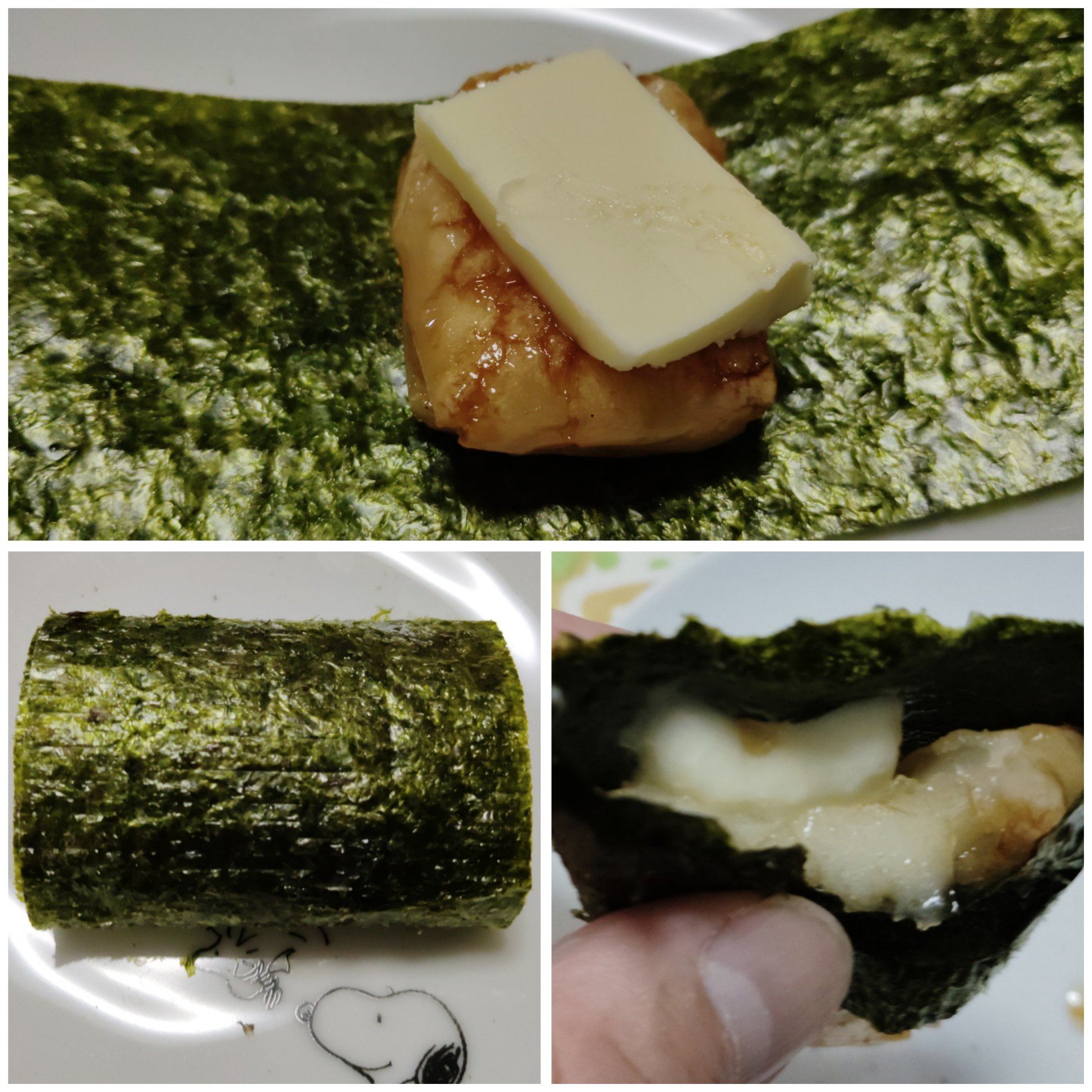 ②少し炙ってパリッとさせた海苔を広げて砂糖醤油をベッタリとつけた餅、少し冷ましてからバターをのせて巻く。出来上がり!簡単!
