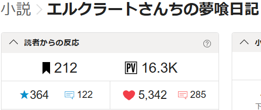 クセツヨ主人公がほどほどに頑張るファンタジー『エルクラートさんちの夢喰日記』をお読みいただき、ありがとうございます。ぽちぽちと♡を押していただいたおかげで、♡5300を達成できました。わあ、愛がいっぱい。とてもほくほくしてます。ありがとうございます。