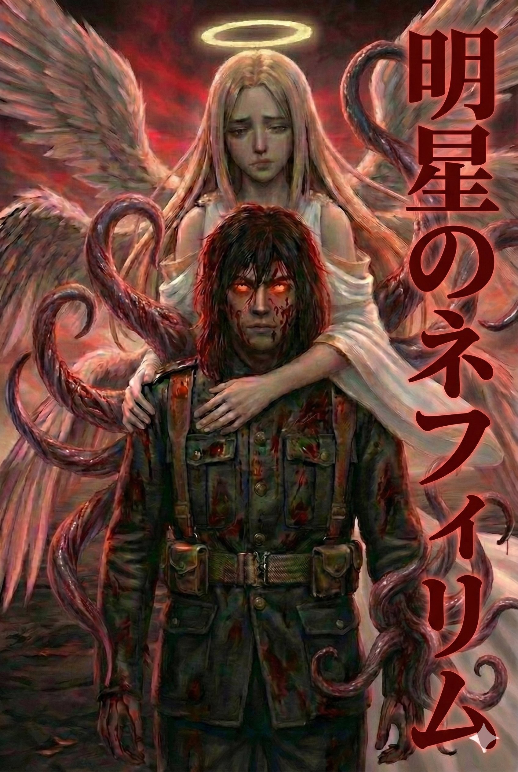 主人公・景明が異形の怪物「ネフィリム」へと堕ちていくイメージイラストも作成しました(※AI生成)。 このビジュアルのような、血と鉄錆の匂いがする復讐譚と巡礼の旅を楽しんでいただければ幸いです。