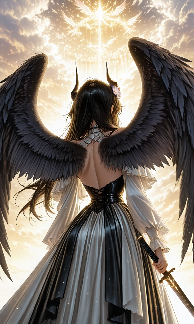 天から舞い降りる無数の翼に、剣で立ち向かう姿。
