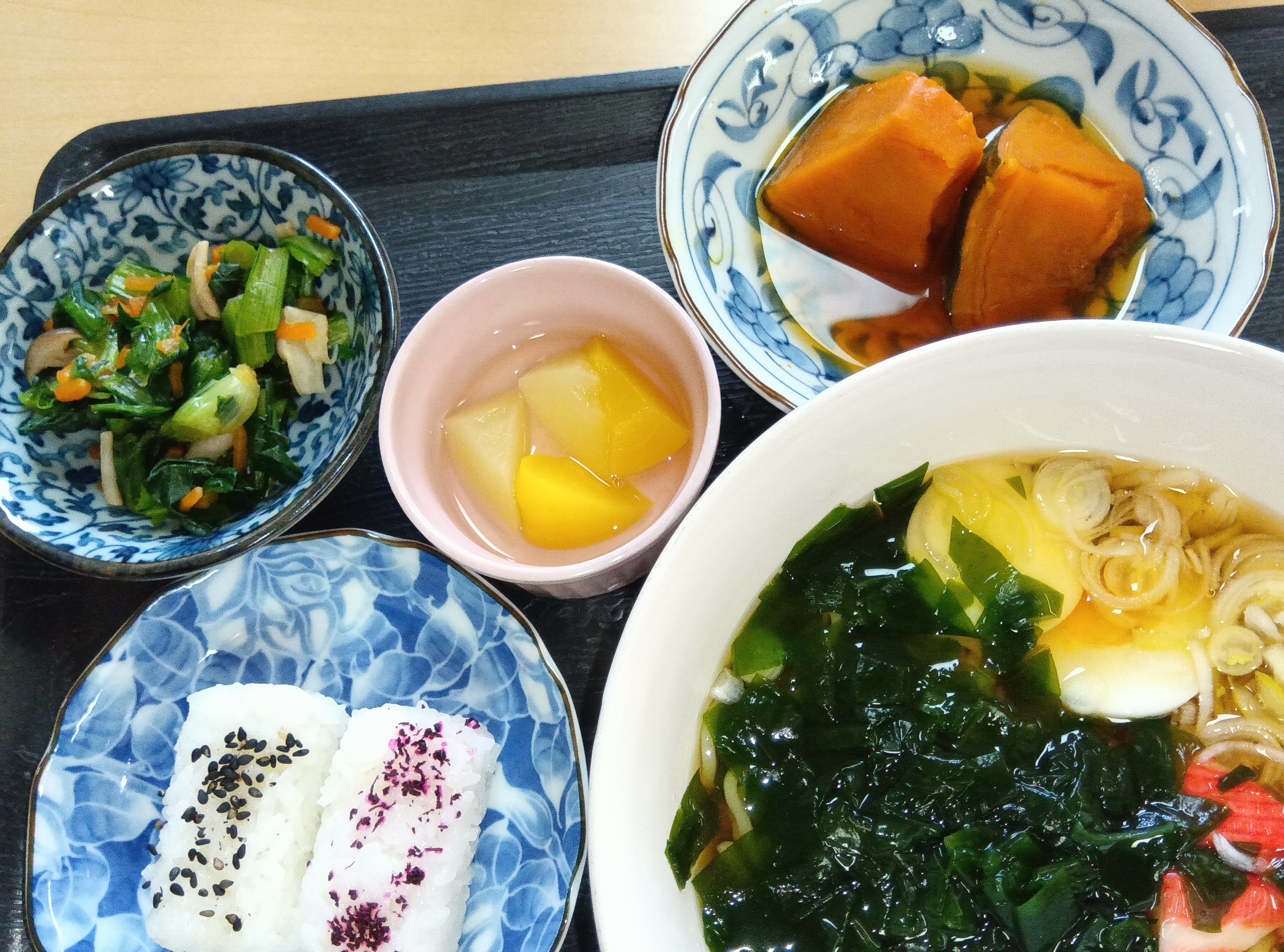 わかめラーメン、俵おにぎり、カボチャの甘煮、小松菜ショウガ和え、白桃と黄桃でした。